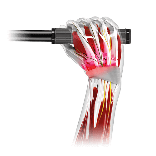 Zoals een geknikte tuinslang minder water doorlaat, zo is bij een vernauwing van de carpale tunnel de doorvoer van zenuwsignalen niet meer optimaal. Dat kan gebeuren als je een te recht stuur hebt, met te weinig buiging naar achteren.
